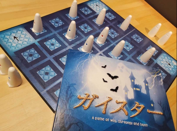 「ガイスター」は2人用の心理戦ボードゲーム。お互いに「良いオバケ(青)」と「悪いオバケ(赤)」を使い、相手の正体を見抜きながら勝利を目指します。